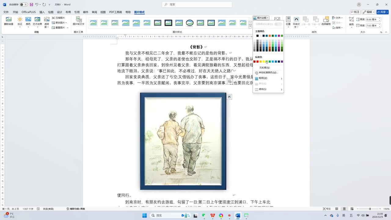 ·这里有一篇文章朱自清的背影,也找一张图片,这个图片可以通过插入菜单选择图片来自于设备,插入进来。