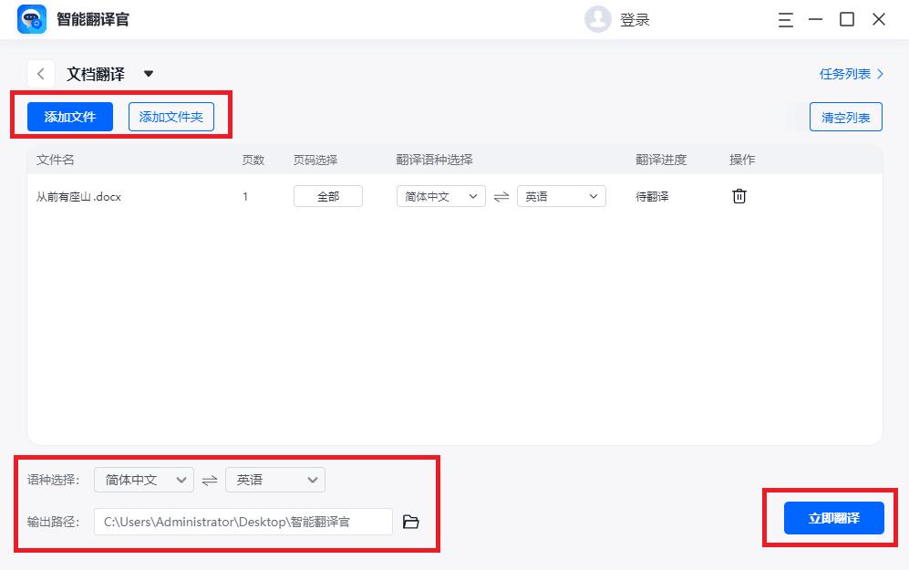 点击【添加文件】上传需要翻译的Word文档,设置Word文档翻译前后的语种,还可以调整输出路径,随后点击【立即翻译】,软件就会自动对Word文档进行快速精准的翻译。