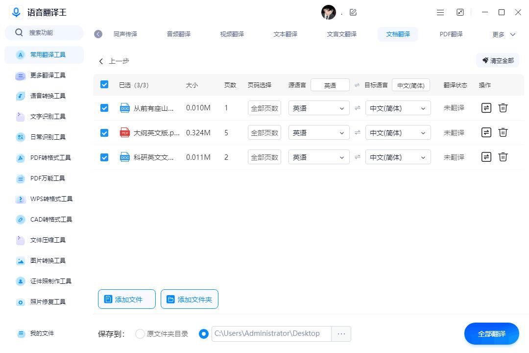 软件支持批量翻译,导入需要翻译的Word文档之后,设置翻译前后的语种、文件和页码,也可以点击【保存到】自定义调整翻译后的文件保存位置。