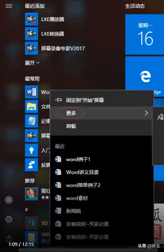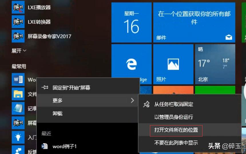 第二种打开方式:单击左下角的开始界面→在菜单中找到Word→单击右键→鼠标拖动到更多→左键单击找到文件所在位置→找到Word的快捷方式→单击右键→找到"发送到"→左键单击桌面快捷方式。