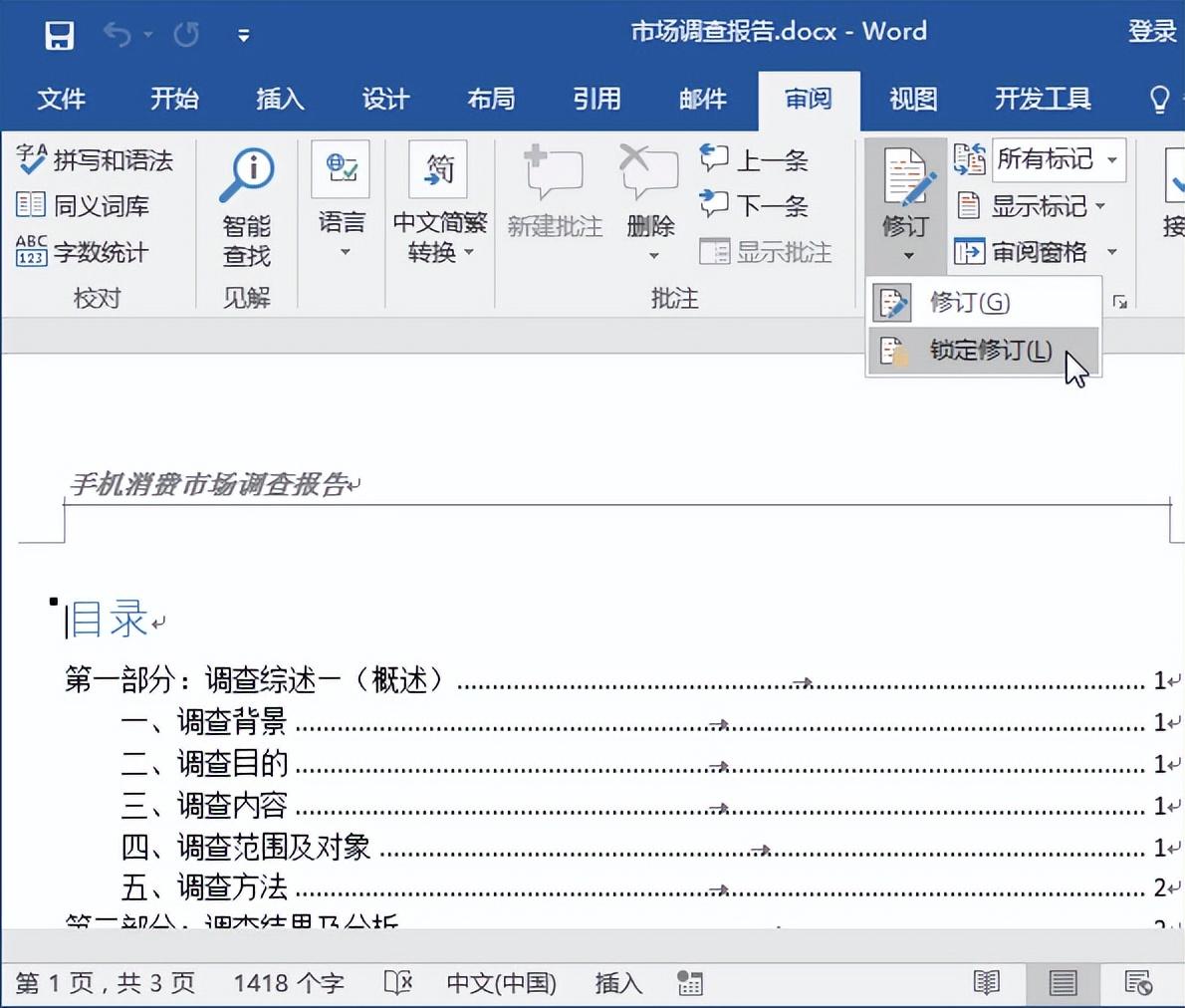 文档中的修订功能,在默认情况下为所有使用者都可以关闭(其方法为:单击【修订】按钮下方的下拉按钮 ,在弹出的下拉列表中选择【修订】选项)。为了防止他人随意关闭修订功能,为审阅工作带来不便,用户可使用锁定修订功能,具体操作步骤如下。