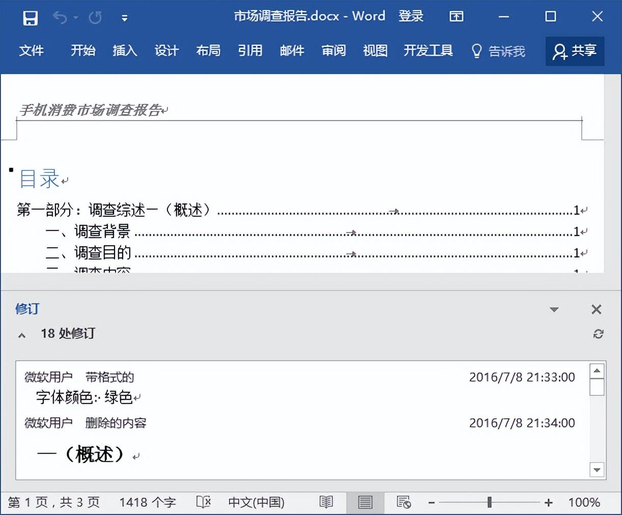 此时,在窗口下方的审阅窗格中可查看文档中的批注与修订。