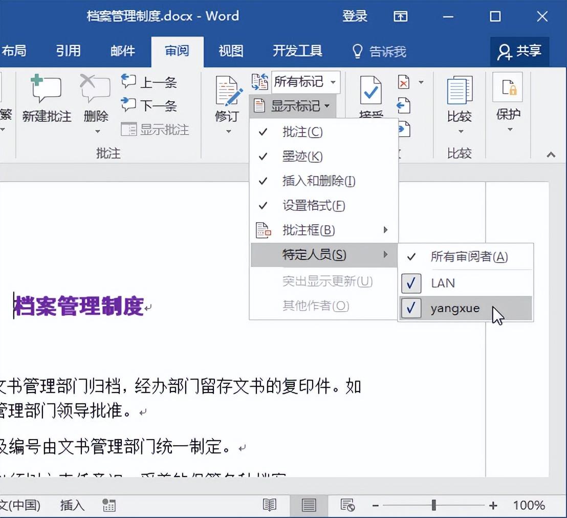 切换到【审阅】选项卡,在【修订】组中单击【显示标记】按钮,在弹出的下拉列表中选择【特定人员】选项,在弹出的级联菜单中设置需要显示的审阅者,本例中由于只需要显示【LAN】的批注,因此选择【yangxue】选项,以取消该选项的选中状态。