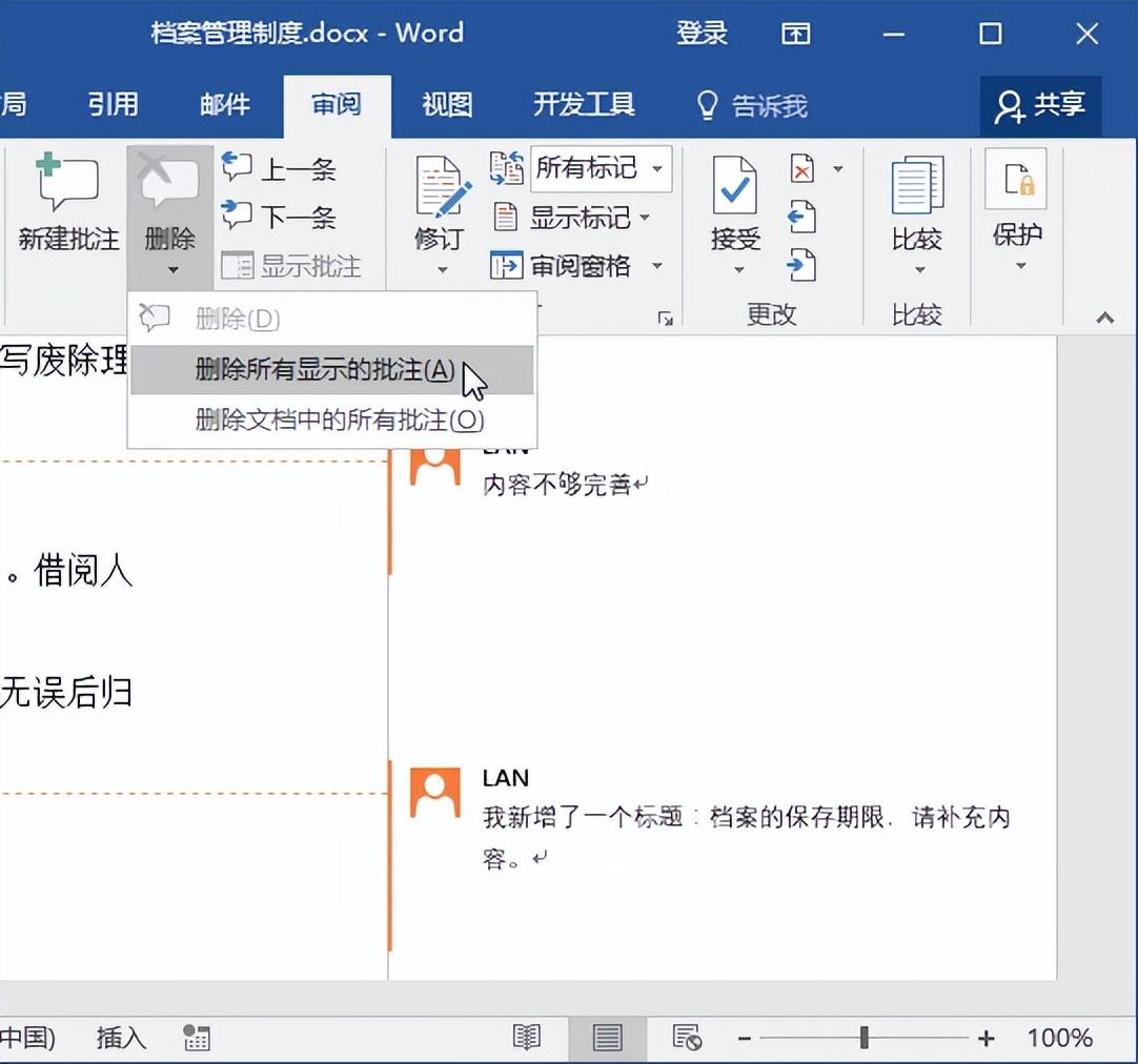 此时的文档中将只显示审阅者“LAN”的批注,在【批注】组中单击【删除】按钮下方的下拉按钮 ,在弹出的下拉列表中选择【删除所有显示的批注】选项,即可删除审阅者“LAN”插入的所有批注。