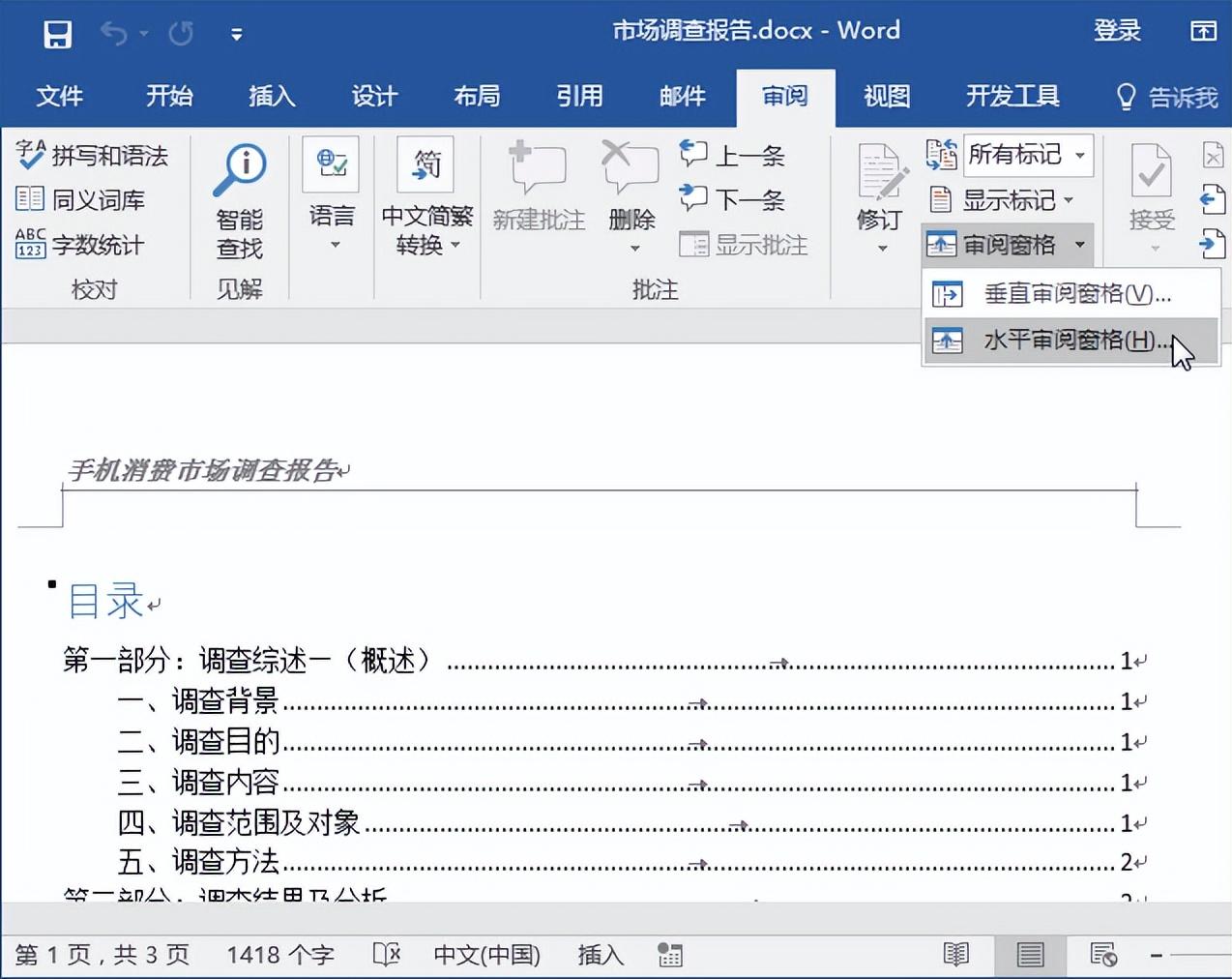 切换到【审阅】选项卡,在【修订】组中单击【审阅窗格】按钮右侧的下拉按钮,在弹出的下拉列表中提供了【垂直审阅窗格】和【水平审阅窗格】两种形式,用户可自由选择,这里选择【水平审阅窗格】。