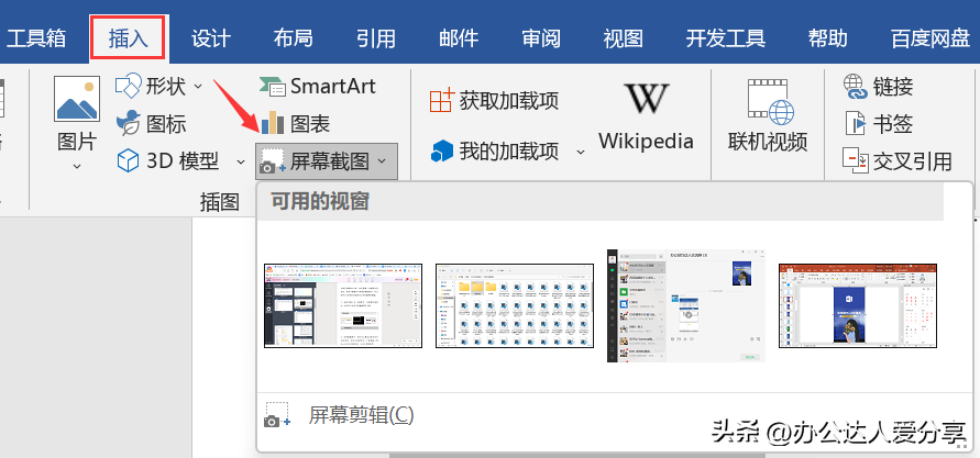 1、选择【插入】-【插图】,在插图功能区中,我们可以找到【屏幕截图】功能;