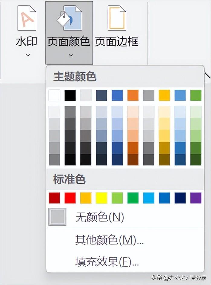 ①选择【页面颜色】,在页面颜色中,我们可以随意更改Word页面背景颜色,如果单一的颜色无法满足你,也可以点击【其他颜色】和【填充效果】进行设置。
