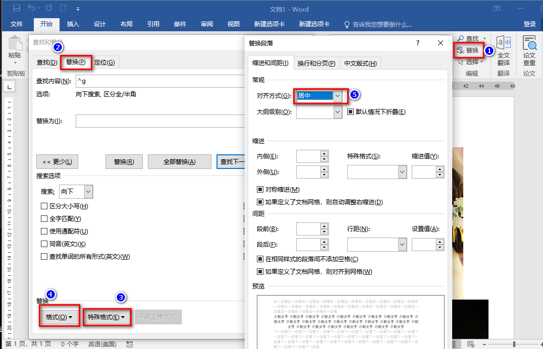 第三步:单击【替换为】,然后点击【格式】,将【对齐方式】设置为【居中】,点击【确定】,最后按下【全部替换】即可。