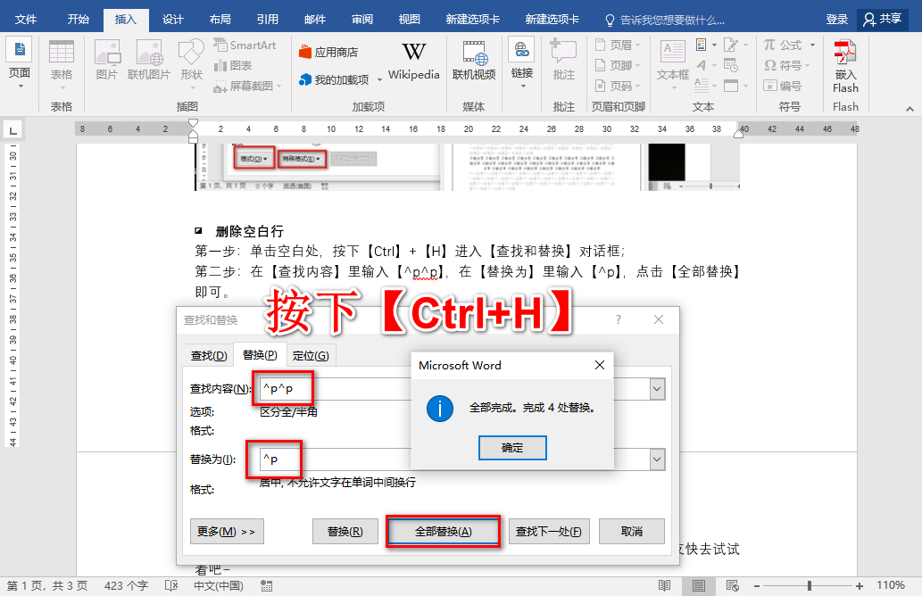 第一步:单击空白处,按下【Ctrl+H】进入【查找和替换】对话框;