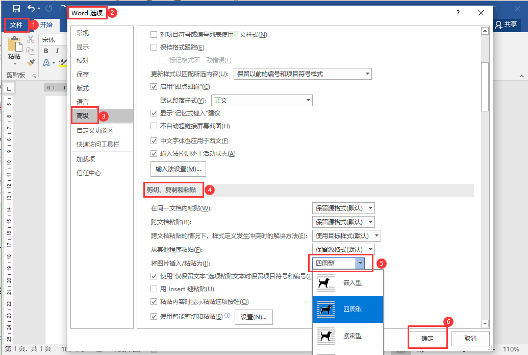 第二步:点击【文件】-【选项】-【高级】,将【剪切、复制和粘贴】的类型修改为【四周型】;
