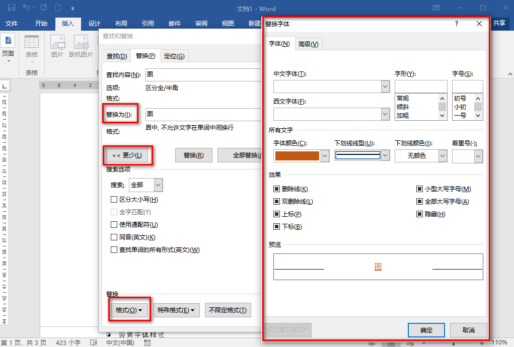 第一步:选中要设置字体样式的文字,例如“图”,按下【Ctrl+H】,在【替换为】输入“图”;