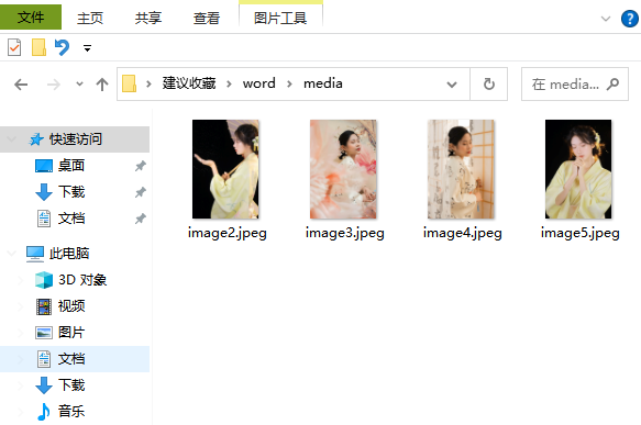 第二步:解压并打开这个文件,依次打开【Word】-【media】文件夹,就可以看到Word里的所有图片啦。