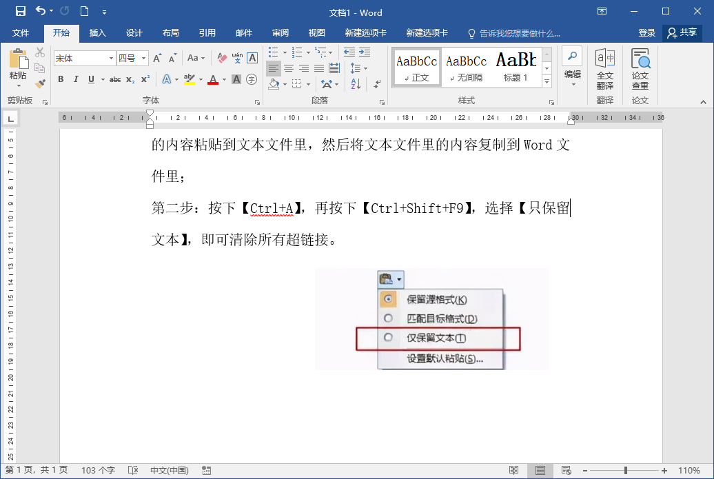 第二步:按下【Ctrl+A】,再按下【Ctrl+Shift+F9】,选择【只保留文本】,即可清除所有超链接。