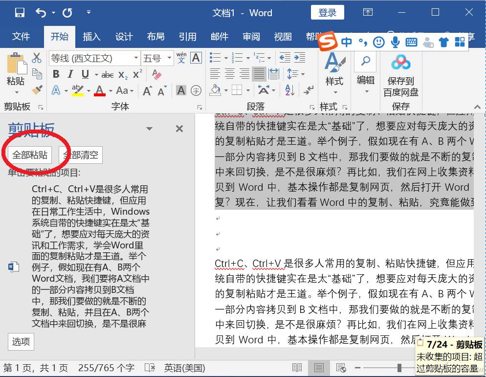 设置完毕后,我们可以连续圈选并按下快捷键“Ctrl+C”复制内容,可以看到右下角会提示剪贴板的复制次数。现在我们可以切换到另一个Word文档中,根据需要在不同的地方单击复制的内容即可粘贴,也可以点击“全部粘贴”一次性把需要的内容都复制过来了。只要处于开启Word文件的状态,从网页复制也可以使用同样的操作。