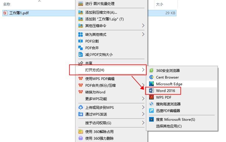 操作方法:鼠标右击PDF文件,在“打开方式”中选择“Word”工具就可以打开了。