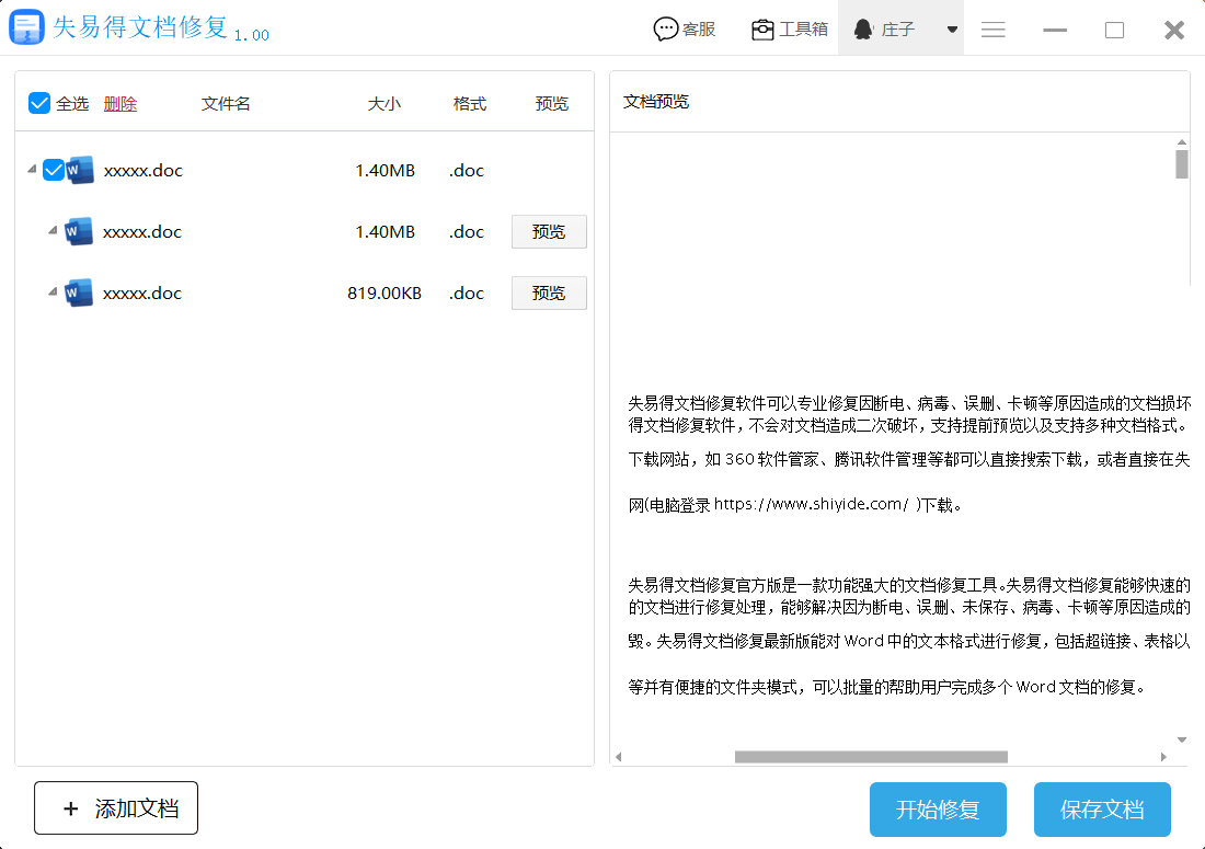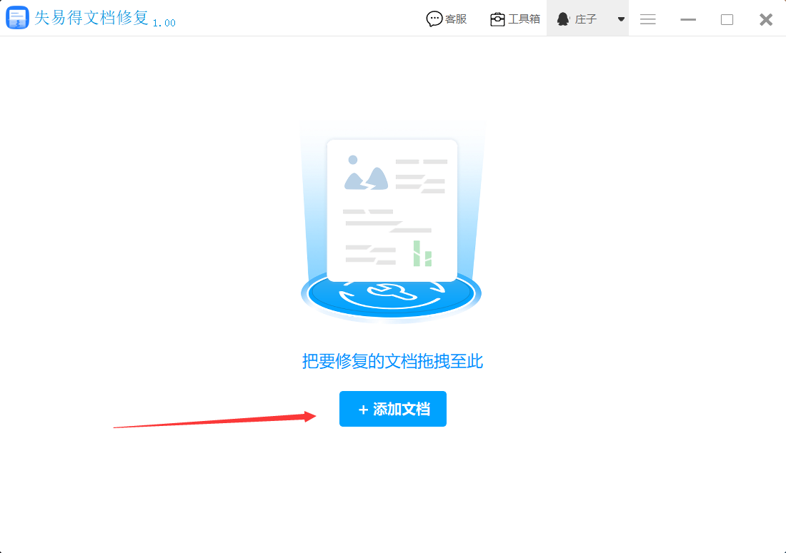第一步:打开失易得文档修复,点击“添加文档”选中要修复的文件,然后上传到软件里。