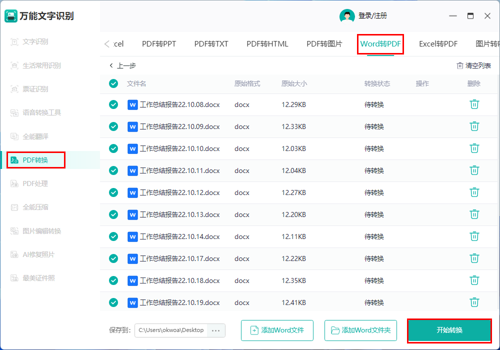那么若我们遇到多个Word文件想要转PDF格式要怎么办呢?不要再傻傻的一个个转换啦!我们可以利用“万能文字识别”来进行,它一次性可以支持多个文件转换,不仅转换效果很好,不会出现有错误的内容,而且转换速度很快,能快速帮我们省时省力又省心的完成所有转换工作。