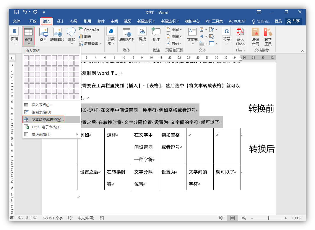 如何把Word文本转换为表格,不用复制到Excel编辑,有更简单的方法!只需要点击【插入】-【表格】-【将文本转成表格】,要记得将【文字分隔位置】设置为【文字间的字符】哦!