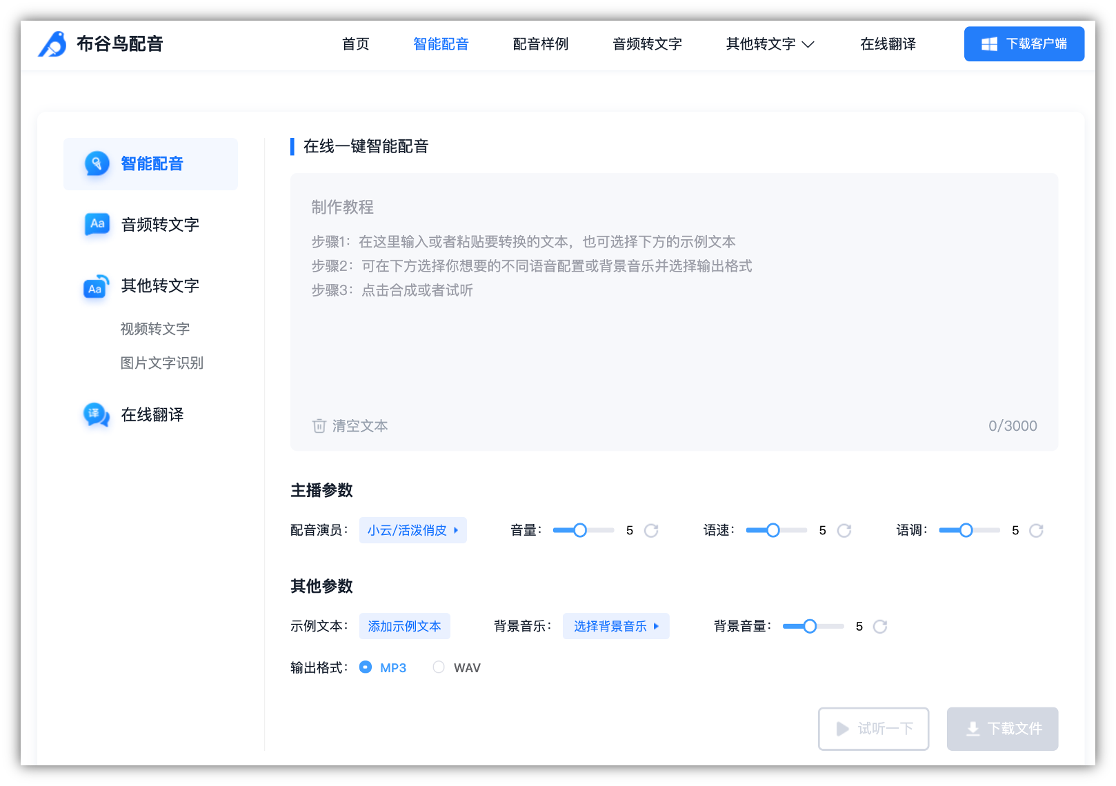 Word音色比较单一,对配音质量有高要求的朋友,不妨试试布谷鸟在线配音。它提供了上百种风格的音线,有大气女声、悬疑解说男声、浙普女声等,自然生动。还可以选择用方言或外语主播进行配音哦。