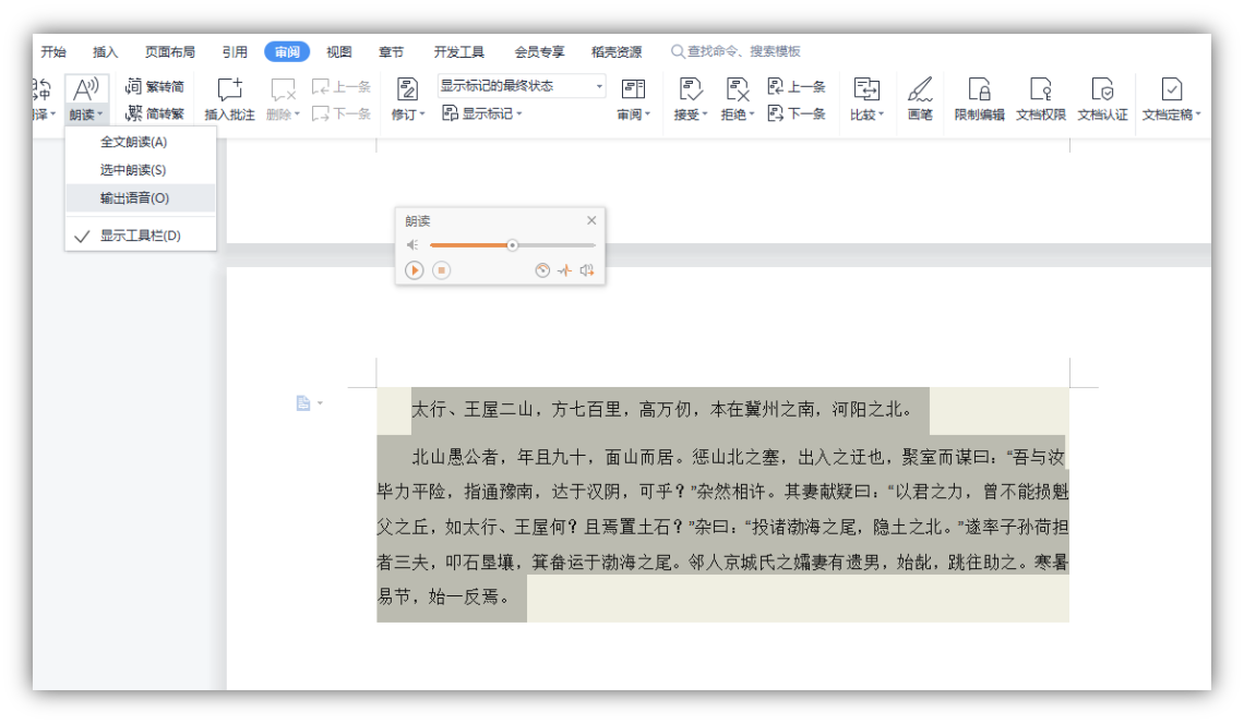 这是经常被忽略的小技能之一,其实【审阅】中就隐藏着一个【朗读】工具,我们可以用它来生成配音,自动朗读文本内容,还能调节声音。