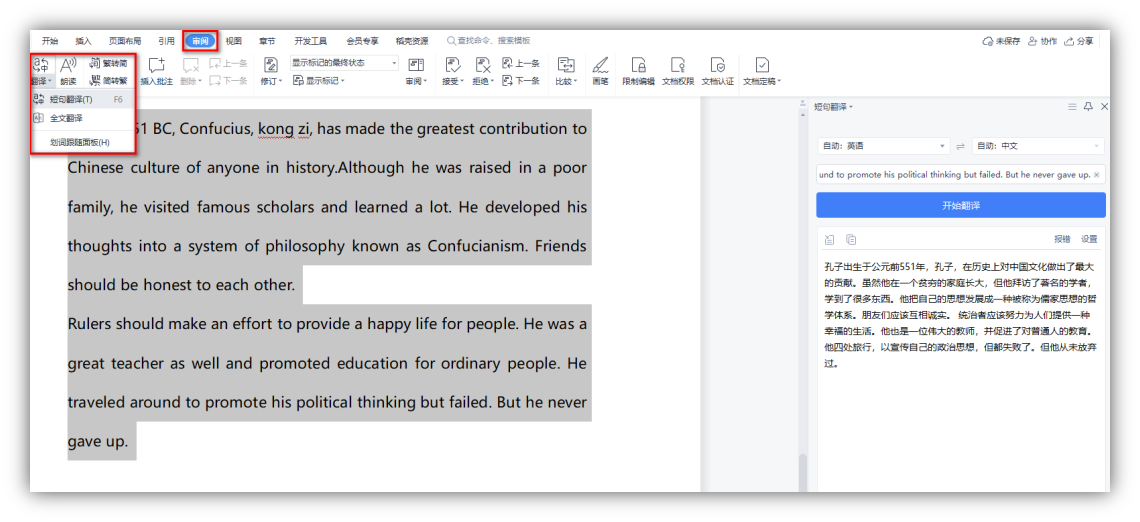 当你需要翻译一份文档时,在Word中就能进行。选中需要翻译的文本,在上方找到【审阅】,选择【翻译】,选择对应的选项,它就会开始翻译了,这里能翻译几十种语言,亲测准确率很高。