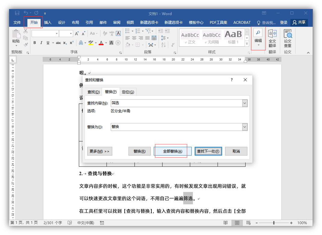 文档内容很多的时候,这个功能就派上用场了,当你发现某个字打错了,我们只需点击【开始】—【编辑】—【查找与替换】,输入该词进行查找,以及输入正确的词,最后选择【全部替换】即可。