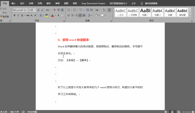Word自带翻译最大的亮点就是,保留原格式,翻译前后的颜色、字号都不会发生变化。