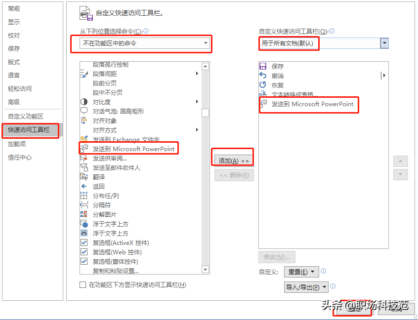 首先打开Word-通过【文件】-【选项】-【快速访问工具栏】-【不再功能区的命令】,添加【发送到Microsoft PowerPoint】的图标,点击【确定】。