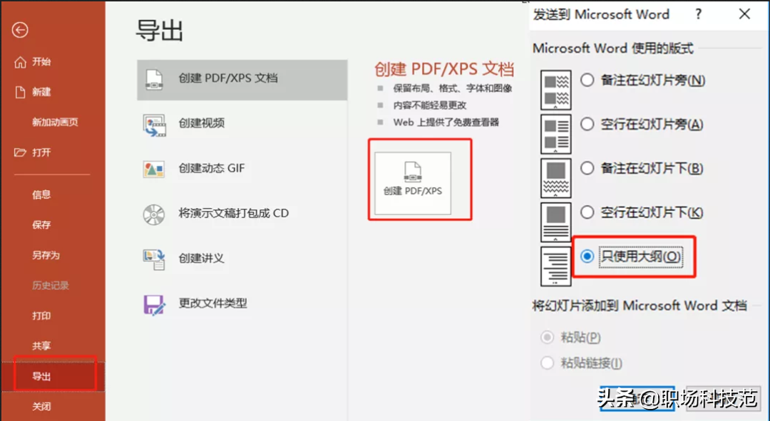 PPT转换为Word的操作要简单得多了,只需进入PPT,选择【文件】-【导出】-【创建讲义】-【只使用大纲】,然后就转成Word了。
