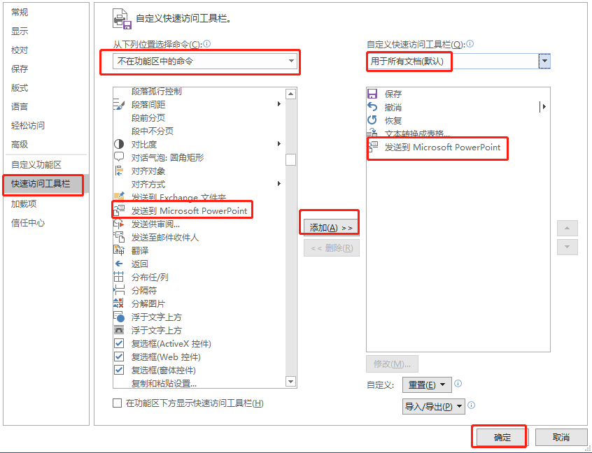①打开Word文档,通过点击【文件】-【选项】-【快速访问工具栏】-【不再功能区的命令】,添加【发送到Microsoft PowerPoint】,再点击【确定】。