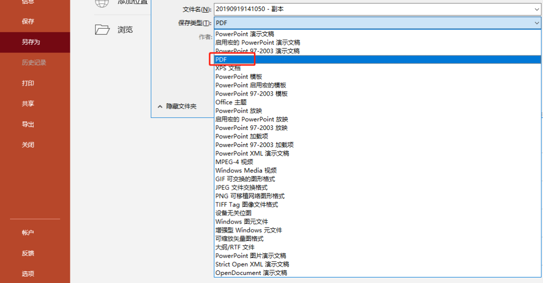 操作步骤:点击进入Word或者PPT文件,选择【文件】-【另存为】-【浏览】,保存类型直接选择【PDF】格式进行保存。