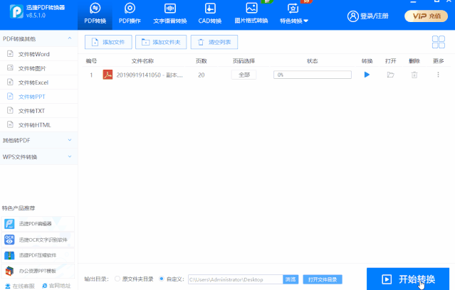操作方法:打开后选择【PDF转PPT】,然后把需要进行转换的文件添加进去,再点击【开始转换】,稍等几秒就可以转换成功了,并且支持批量转换哦。