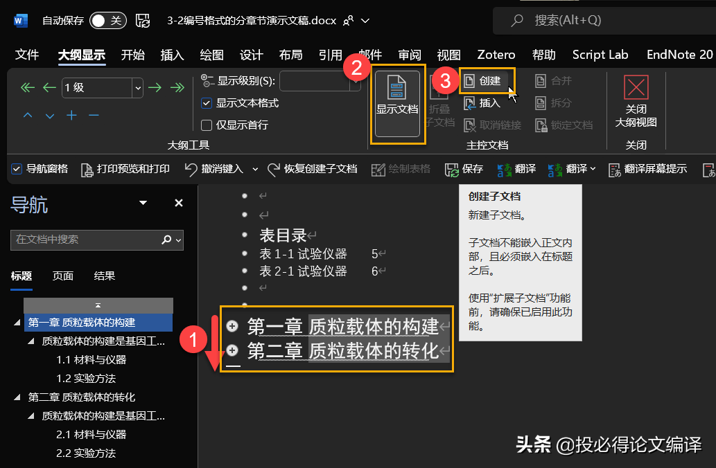 ➤ Tips2:也可以先创建章节的子文档,再创建合并的主控文档,手动插入。