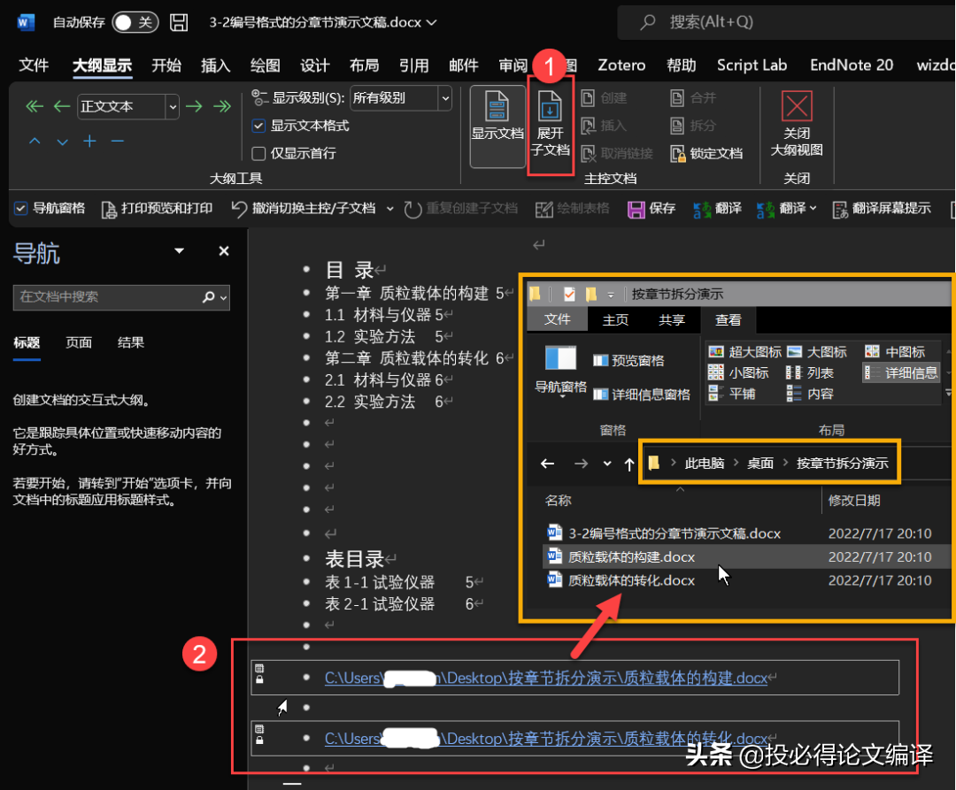 4️⃣点击‘折叠子文档’,可将拆分章节,保存为单个文件,其保存在源文件(主控文档)同一个目录下,此时,主控文档中显示为超链接。点击‘展开子文档’,显示具体内容。只能打开主控文档与子文档其中之一,进行编辑,同时打开,只能在子文档中编辑,主文档创建子文档的部分为只读。保存后,即可在另一个文档显示。通过‘取消链接’与‘锁定文档’,进行独自编辑的控制。