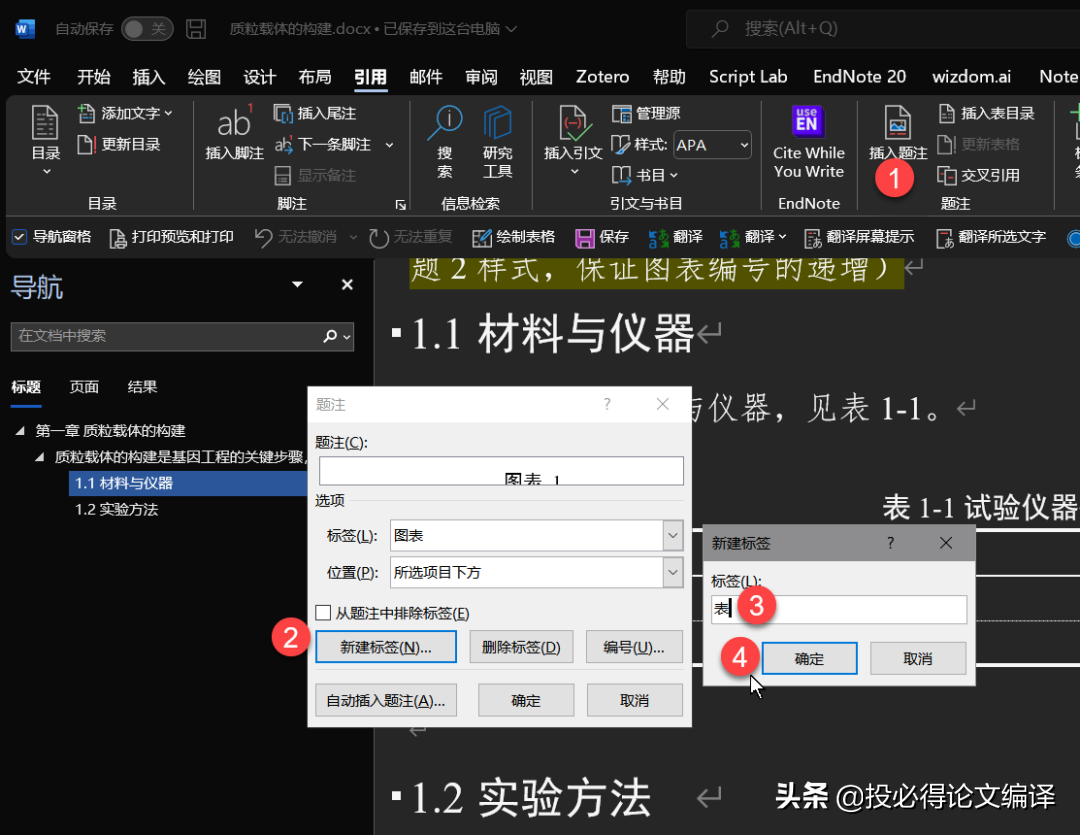 新建标签,添加表/图,就可继续使用引用中插入题注,与交叉引用功能,且接着已有图/表标题编号,继续编号。参考本系列的毕业论文必备Word设置1——标题样式设置与目录自动生成。