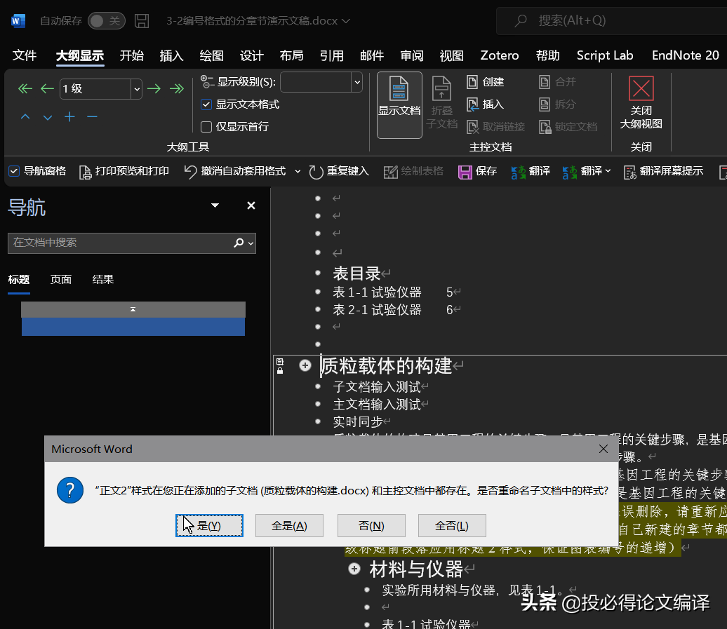 最好在主控文档中配置好所有的样式,不要修改子文档中使用的样式,最后合并后再进行最后样式修改。如果是先创建章节的子文档,就需要保留子文档的表格式、样式等设置。在哪个文档发生了更改,就保存哪个文档的修改,重命名另一个文档的样式。根据具体情况,选择。