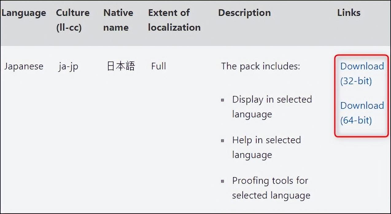 选择后,语言包的详细信息将显示在下方。在窗口的右侧,选择与您在 Windows 上运行的体系结构相对应的下载。