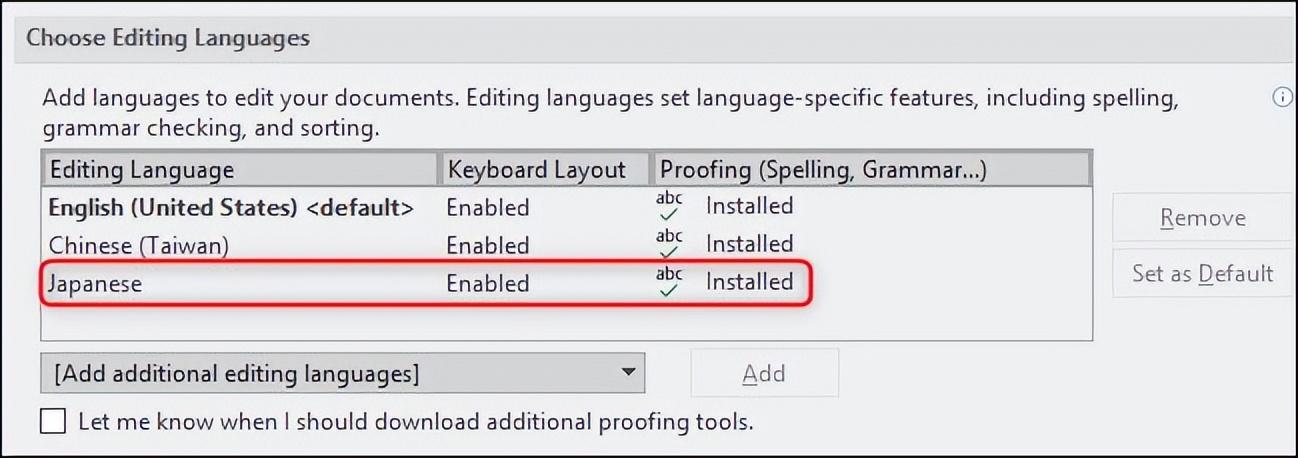 这就是设置编辑和校对语言所需的全部内容。但是,如果该语言在“键盘布局”下显示“未启用”,请单击该链接并按照添加语言包的说明进行操作。