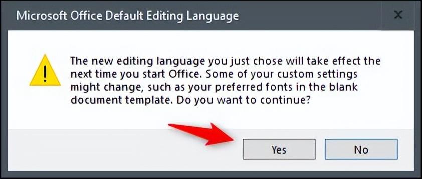 将出现一条消息,通知您选择的编辑语言将在您下次启动 Office 时生效。它还警告您某些设置可能会更改,因此请注意这一点。如果您可以继续前进,请选择“是”。
