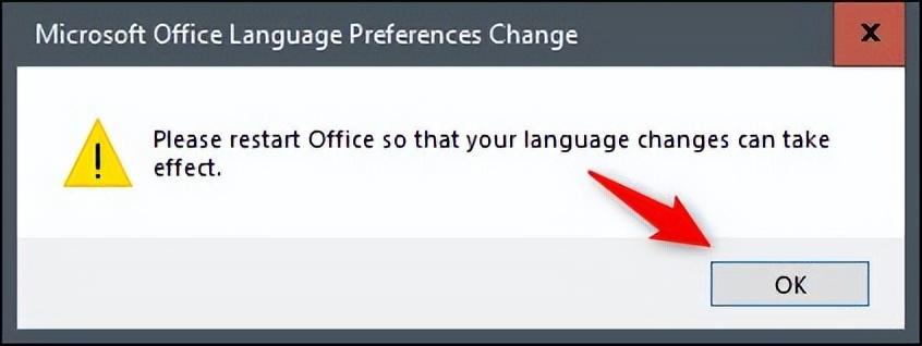 现在将提示您重新启动 Office。这是新语言生效所必须的。