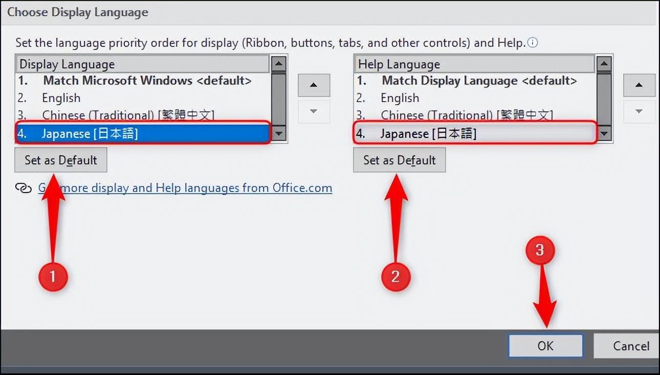 我们仍将在“Word 选项”窗口中工作。这一次,找到“选择显示语言”部分。您将在此处看到两个单独的菜单:“显示语言”和“帮助语言”。为两者选择所需的语言。您还需要为两者选择“设为默认值”。完成后,单击“确定”。