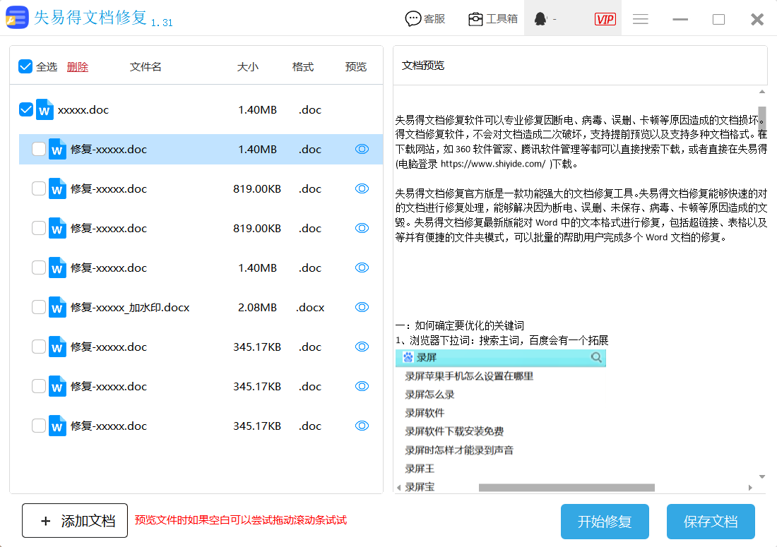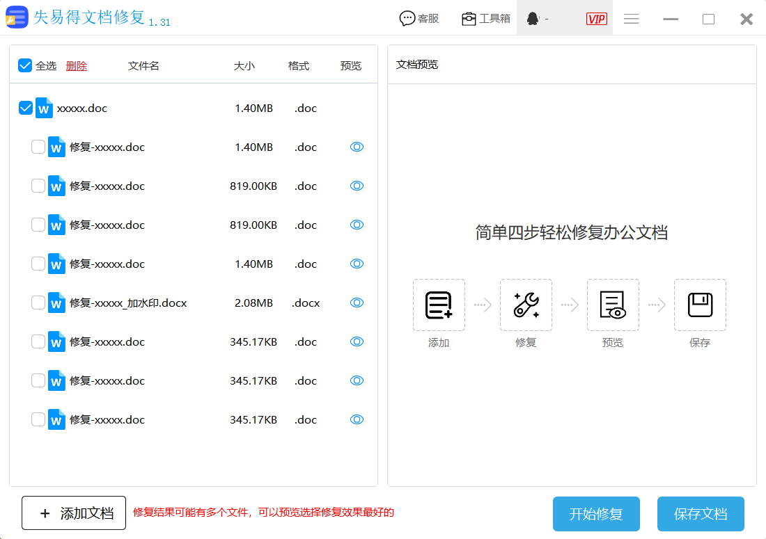 如果碰到真正打不开的word文档,想要恢复就必须要找相对应的修复工具,比如说失易得文档修复软件,就是专业解决因断电、误删、未保存、病毒、卡顿等原因造成的文件损毁。还能对文本格式进行修复,包括超链接、表格以及图表等并有便捷的文件夹模式,可以批量的帮助用户完成多个文档的修复。具体的修复步骤如下: