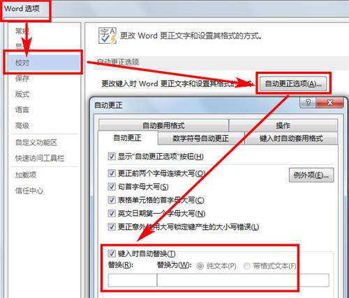 点击【文件 - 选项 - 校对 - 自动更正选项】,勾选【键入时自动替换】(默认勾选),输入文本。