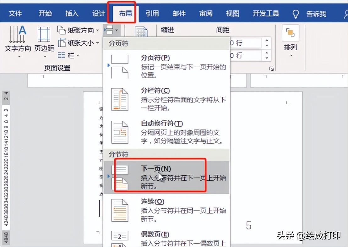 1.首先我们将鼠标定位到第四页的末尾,点击「布局」-「页面设置」-「分隔符」-「下一页」;鼠标再次定位到第五页开头处,点击「下一页」;最后将鼠标定位到第五页,点击「布局」-「页面设置」-「纸张方向」-「横向」即可。