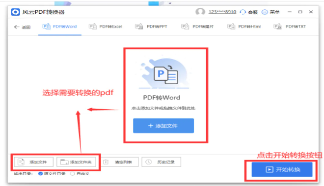 2、在选择PDF转文件这个选项后,我们可以将自己想要转换的内容添加到这里,或者直接将文件拖入操作界面添加,然后在左下角的输出目录进行选择文件的存储路径,确认好之后,点击右下角的开始转换进行文件格式的转换,当文件后的进度条进行到100%的时候就表示其他格式的文件已经转换成PDF格式的文件了,后续用户就可以将它插入word文档中。