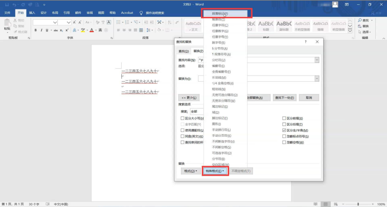 步骤三:点击【特殊格式】,在【查找内容】中填入两次【段落标记】,在【替换为】中填入一次【段落标记】;