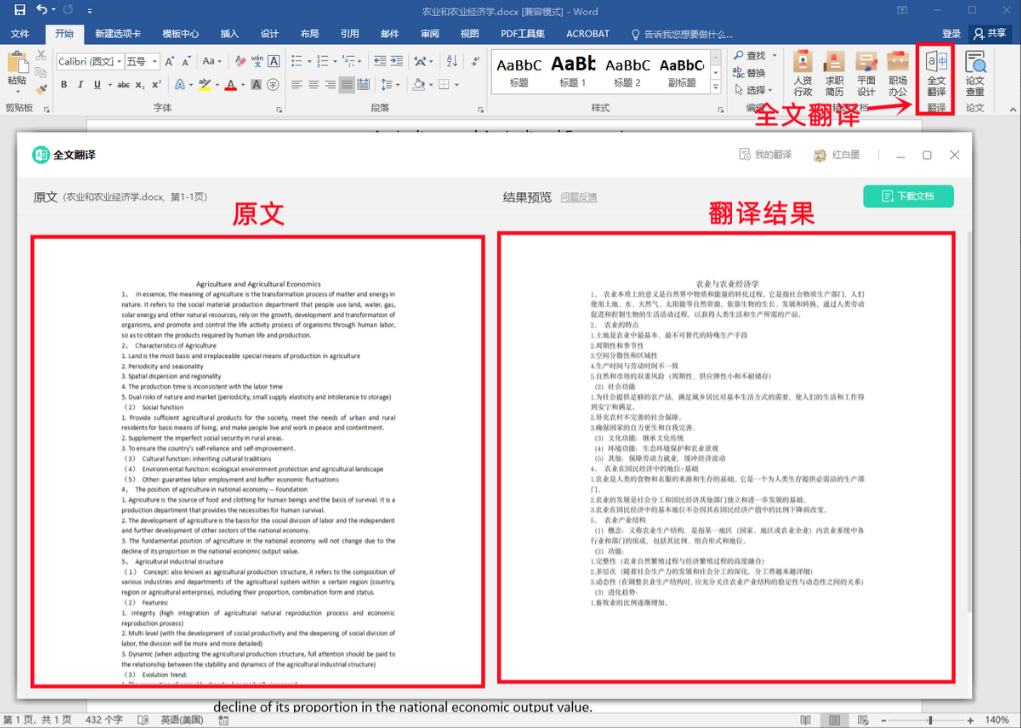 步骤一:打开Word文档之后,在【开始】里面找到【全文翻译】并点击就完成啦!