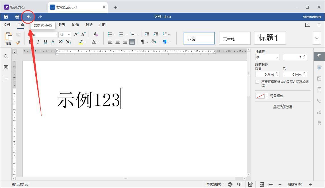 2、接着,在工具栏里面找到“复原”图标,并点击,可以看到成功撤销“123”;