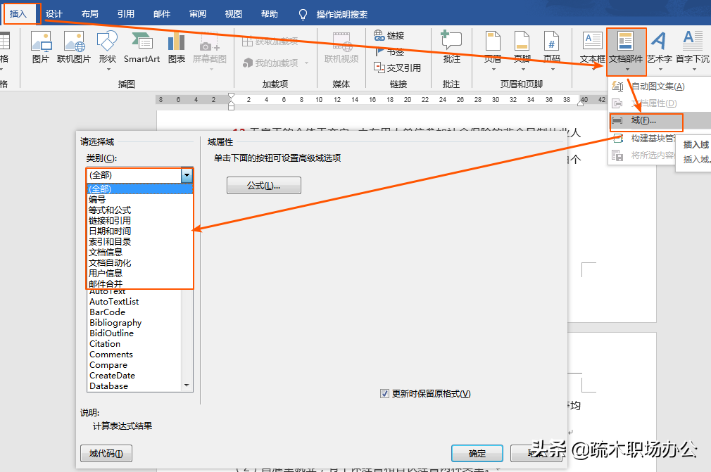 在word中,打开【插入】选项卡——【文档部件】——【域】,在【域】的功能对话框中,可以看到有全部、编号、等式和公式等多种类别,通过选择这些类别,可以使用域来进行自动更新的相关功能。包括公式计算、变化的时间日期、邮件合并等。