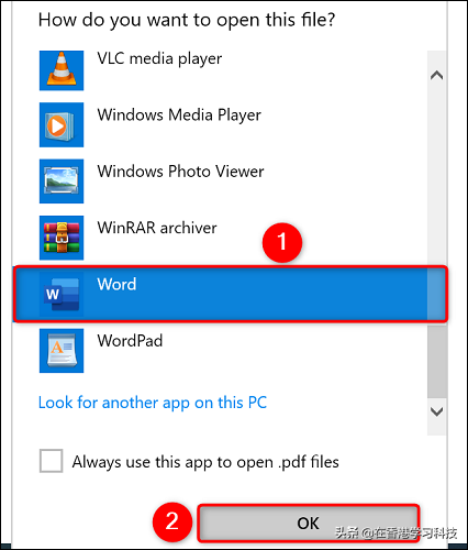 选择 Word 后,在底部单击“确定”。
